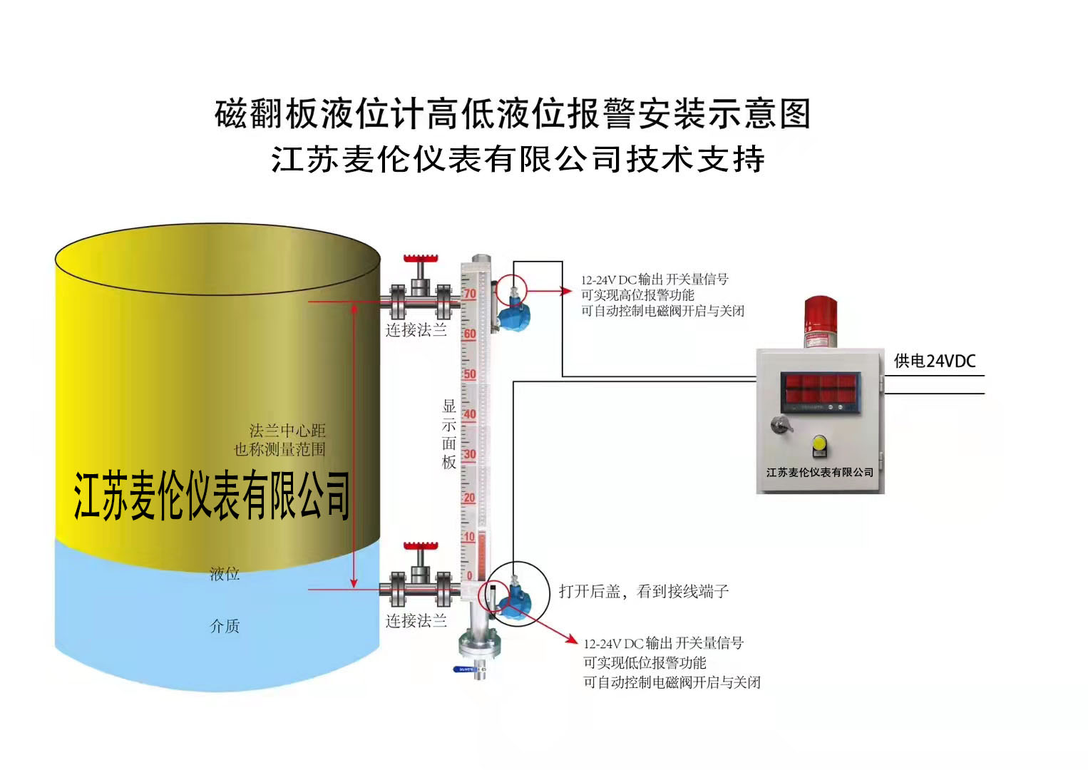 磁翻板液位計的結構原理。當被測容器中的液位上升和下降時,液位計主體管中的磁性浮子也會上升和下降,浮子中的永磁鋼通過磁性聯軸器,驅動紅,白翻柱翻轉傳輸至磁性翻轉柱指示器,以實現清晰的液位指示。通過內置簧片觸點的開閉,實現電流或電壓信號的傳輸。磁性翻板液位計通常在出廠時通過模擬方法(本方法規范中未描述)進行調整,以確保其在供應