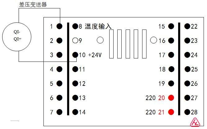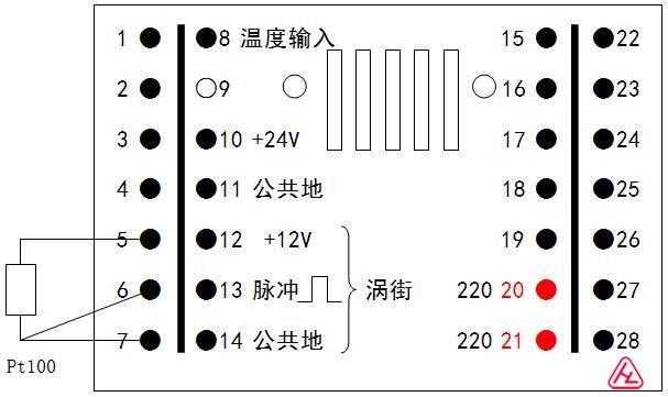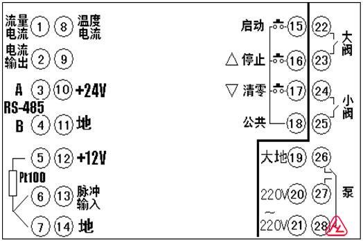 1.模擬流量信號輸入;2.流量再發送電流輸出;3.RS-485,A;4.RS-485,B;5.Pt100,A;6.Pt100,B;7.Pt100,B;8. 溫度電流信號輸入;9. 空;10. 24V; | 11.公共地(GND);12. 12V;13.脈沖流量信號輸入;14.公共地(GND);15.發料啟動按鈕;16.發料停止按鈕;17.清零/復位按鈕;18.按鈕公共接點;19.接大地;20.220V; |