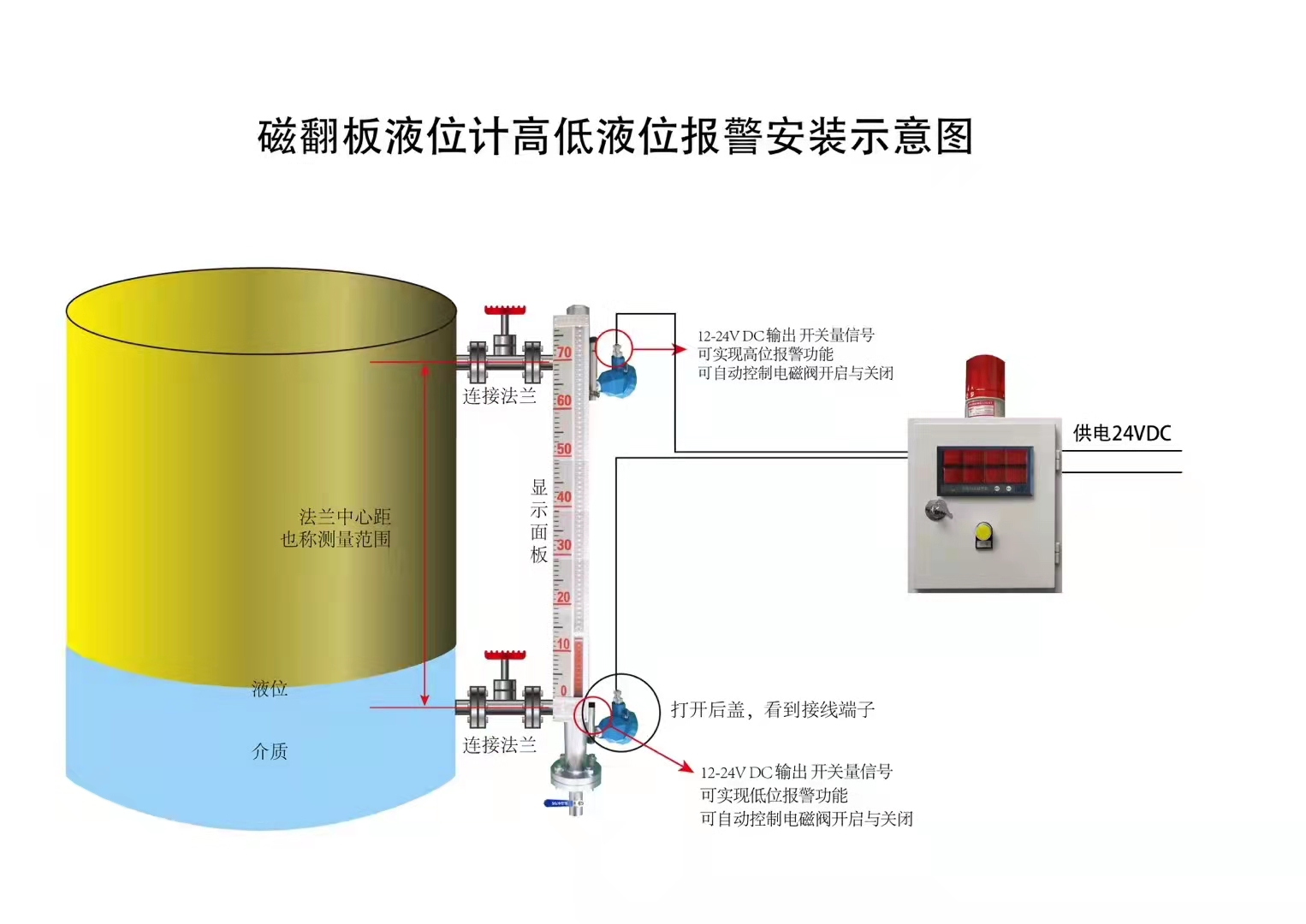 當體管中的磁性浮球隨著液位上升時,色卡翻轉顯示液位。也可在本體管上加裝磁性開關或遠傳變送器,輸出開關信號或模擬量信號。適用于高溫、高壓、耐腐蝕性等場合,可就地顯示和遠程控制。