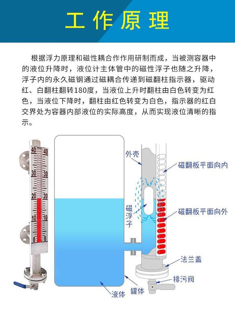 液位計(jì)根據(jù)浮力原理,浮子在測(cè)量管內(nèi)隨液位的升降而上、下移動(dòng),浮子內(nèi)的*磁鋼通過(guò)磁耦合作用,驅(qū)動(dòng)紅、白色翻柱翻轉(zhuǎn) 180 。 液位上升時(shí),翻柱由白色轉(zhuǎn)為紅色,下降時(shí)由紅色轉(zhuǎn)為白色,從而實(shí)現(xiàn)液位的指示。
