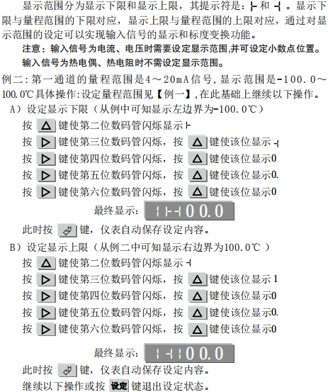 例三:**通道的量程范圍是4~20mA信號,顯示范圍是-100.0~100.0℃ 記錄范圍是0.0~150.0℃。