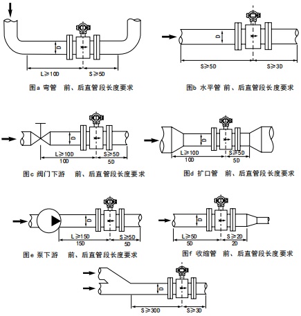 為了改善渦流與流場畸變的影響,流量計安裝的前、后直管段長度有一定要求,否則會影響測量精度(也可安裝整流器,盡量避免在靠近調(diào)節(jié)閥和半開閥門之后安裝)。