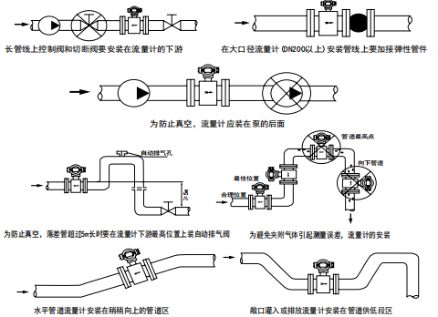 為了方便檢修流量計,*好為流量安裝旁通管,另外,對重污染流體及流量計需清洗而流體不能停止的,必須安裝旁通管。流量計在管線上的安裝要求