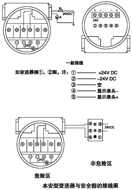 4、變送器的本安導線不得與高壓電纜線一起敷設,導線長度應盡量縮短,導線的分布電感、分布電容及變送器的有效電感、有效電容之和,不得超過安全柵規定的額定值。