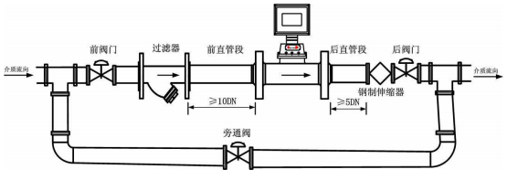 流量計表體應(yīng)盡量保持水平安裝,不推薦垂直安裝,以防止換能器安裝孔的空腔積水,影響超聲波的傳輸(若氣質(zhì)干燥則無影響),降低測量準(zhǔn)確度。在氣體介質(zhì)較臟的場合,可在流量計的上游以不影響被測氣體流場的位置安裝效果良好的氣體過濾器。嚴(yán)禁帶流量計焊接管道法蘭,建議做短節(jié)輔助焊接管道法蘭,以保證表個體整體受力情況。安裝流量計前要將管道內(nèi)部清理干凈。為了便于維修維護,不影響正常的使用,建議設(shè)置旁通。流量計安裝在室外使用時,建議加配防護罩,以免雨水浸入和烈日曝曬而影響流量計使用壽命。流量計需可靠接地,但不得與強電系統(tǒng)地線共用。