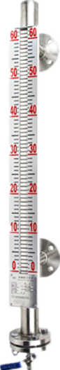 磁翻板液位計是根據浮力和磁耦合原理研制的。這種液位計一般采用磁致伸縮原理,通過波導線傳輸磁浮子的信號,然后通過電路處理得到液位值。當被測容器中的液位上升和下降時,液位計主體管中的磁浮子也會上升和下降,當液位上升時,浮子中的磁鋼通過磁耦合器驅動紅,白翻柱轉180°傳輸到磁翻轉柱指示器,翻轉柱由白色變為紅色,當液位下降時,翻轉柱由紅色變為白色,指示器的紅白交界處為容器內液位的實際高度,以實現液位的清晰指示。在高溫、高壓、高粘度、強腐蝕條件下,可實現高密封、防泄漏、安全可靠的液位測量。可用于各種塔、罐、罐、球罐、鍋爐等設備的介質液位檢測.
